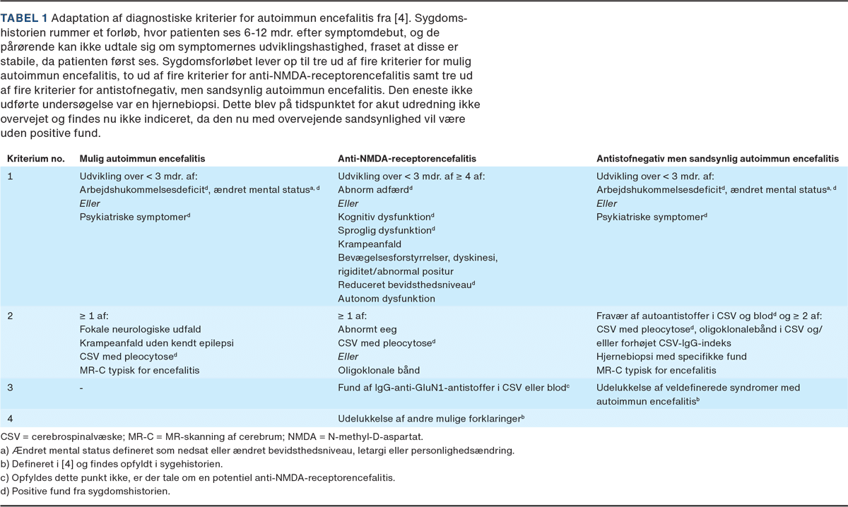 Neurologisk undersøgelse var uden fokale udfald. En MR-skanning af cerebrum (MR-C) og ekg viste normale forhold. Foruden mononukleær pleocytose med leukocytter på 39 mia./l fandt man normale forhold i cerebrospinalvæske (CSV) med følgende værdier: CSV-protein: 0,43 g/l, CSV-glukose 4,8 mmol/l, IgG-indeks 0,50 og CSV-erytrocytter 0. Behandling for viral og bakteriel encefalitis blev startet, men hurtigt afkræftet af infektionsmedicinerne. Paraneoplastiske blodprøver, autoimmune antistoffer i både serum og CSV, PET med flourdeoxyglukose (FDG-PET), PET-CT, CT af thorax, abdomen og det lille bækken (CT-TAB) og undersøgelse for oligoklonalebånd i CSV var uden positive fund. På indikation for seronegativ autoimmun encefalitis startede man højdosis methylprednisolon, hvorpå CSV-leukocytter blev normaliseret. Udredning i psykiatrien var uden tegn til specifik psykisk sygdom. Neuropsykologisk testning viste afvigende præstationer inden for opmærksomhedsspændvidde, arbejdshukommelse, planlægning/problemløsning og visuelt rumlige forhold, upåfaldende ordmobilisering og svag indlæringsevne.