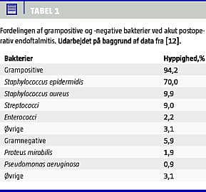 Bakterier, svampe og parasitter kan alle være udløsende årsager til akut postoperativ endoftalmitis. Den bakterielle endoftalmitis er langt den hyppigste [7] og forekommer i ca. 90% af alle tilfældene [9] med klar overvægt af grampositive bakterier. I det hidtil største studie, Endoftalmitis Vitrektomi Studiet (EVS), som omhandlede akut postoperativ endoftalmitis, var 94,2% (Tabel 1 ) af tilfældene med positivt dyrkningssvar forårsaget af grampositive bakterier [10]. Bakterierne stammer i langt overvejende grad fra patienternes egen flora, og i studiet var den hyppigste bakterie Staphylococcus epidermidis , som udgjorde 70% af de grampositive bakterier [10].