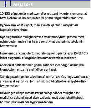 Hos et lille mindretal af hypertensive patienter har blodtryksforhøjelsen baggrund i hypersekretion af aldosteron, katekolaminer eller kortisol. Rettidig opsporing af disse patienter er vigtig: De har ofte svær og behandlingsresistent hypertension, er i risiko for livstruende komplikationer, og der er malignitetsrisiko. Ydermere er tilstandene med moderne kirurgiske metoder potentielt kurable gennem relativt små indgreb med lav komplikationsrisiko, f.eks. laparoskopisk adrenalektomi. Ingen af vores nuværende screeningsprøver er imidlertid så sensitive og specifikke, at de egner sig til bred screening. Screeningen må derfor begrænses til populationer med øget risiko for endokrin hypertension, der selekteres på basis af kliniske kriterier og almene undersøgelser. Det skal pointeres, at både hvad angår hypofyse og binyrer, er benigne nonsecernerende adenomer hyppige i baggrundsbefolkningen, ligesom secernerende adenomer ofte er små og evt. ikke påviselige ved billeddiagnostik. For at undgå fejlslutninger må biokemisk diagnostik derfor gå forud for billeddiagnostik, ligesom endelig klassifikation af ætiologi ofte vil inkludere funktionsundersøgelser før anbefaling af kirurgi. I det følgende beskrives udvikling, status samt perspektiver for området.
