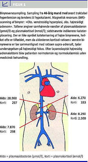 Differentiering mellem unilateralt adenom og bilateral hyperplasi er en specialistopgave, der oftest vil inkludere teknisk krævende undersøgelser - herunder binyrevenesampling (se eksempel i Figur 1 ) - og bør forbeholdes få centre.