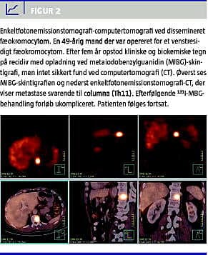 Er fæokromocytomdiagnosen biokemisk sandsynliggjort, fortsættes med billeddiagnostik (computertomografi (CT) eller MR) kombineret med funktionsundersøgelser (meta-iodobenzylguanidin (MIBG), evt. octreotidskintigrafi). Med anvendelse af nyere teknologi (enkeltfotonemissionstomografi (SPECT)-CT) kan CT- og skintigrafibilleder fusioneres, hvorved diagnostik af atypiske lokalisationer lettes. Et eksempel herpå fremgår af Figur 2 . Grundet risiko for hypertensive kriser er effektiv alfablokade obligat forud for operation for fæokromocytom. Beta-blokade før iværksat alfablokade kan resultere i paradoks blodtryksstigning og er således kontraindiceret. Biopsi vil kun sjældent være indiceret ved uafklaret binyreforstørrelse og aldrig uden forudgående udelukkelse af fæokromocytom grundet risikoen for provokation af hypertensive kriser.
