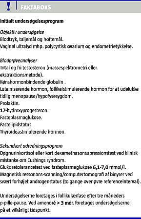 Flere kliniske tilstande kan forveksles med PCOS. I et tidligere dansk patientmateriale var prævalensen af alvorlige endokrine sygdomme fem ud af 340 blandt kaukasiske præmenopausale kvinder, der var henvist for hirsutisme [3]. En lav prævalens af alvorlig endokrin sygdom må holdes op imod prognosen for disse sygdomme, og det forhold at behandlingen afgørende adskiller sig fra behandlingen af PCOS.