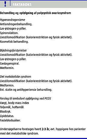 Summary Endocrinological assessment, treatment and follow up on polycystic ovary syndrome Ugeskr Læger 2010;172(3):196-199 Polycystic ovary syndrome (PCOS) has a prevalence of 5-10% and is defined as oligomenorrhoea, hyperandrogenaemia and/or polycystic ovaries and the exclusion of other aetiologies for the patient's symptoms. There is currently no agreement on the initial evaluation programme for women referred with PCOS or on how the syndrome should be treated. Women with PCOS have an increased risk of the metabolic syndrome upon diagnosis and increased long-term risk of type 2 diabetes, cardiovascular disease and endometrial cancer. In the present overview, we give recommendations for relevant follow up examination of patients with PCOS based on a search of the available literature.