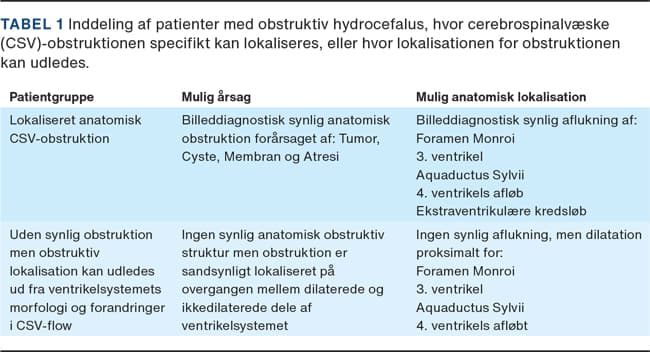 Hydrocefalus er defineret som ventrikulomegali som følge af ophobning af cerebrospinalvæske (CSV). Tilstanden forårsages af en bred, heterogen vifte af underliggende patologi, og prævalensen er samlet 85/100.000 med en overvægt af børn (< 18 år) og ældre (> 65 år) [1]. Overordnet inddeles sygdommen i en obstruktiv og en kommunikerende form, hvor obstruktionen for CSV’s afløb kan være lokaliseret intra- eller ekstraventrikulært [2].