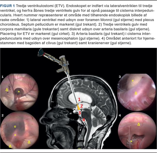 Selvom endoskopisk behandling af obstruktioner i ventrikelsystemet blev udført allerede fra 1918 til 1930’erne af den neurokirurgiske pioner Walter Dandy, vandt indgrebet ikke stor udbredelse på grund af høj dødelighed og blev efterhånden forladt [3]. Først da shunting af CSV gennem et ventilstyret drænsystem blev introduceret i 1950’erne, fik man en behandling for hydrocefalus, hvilket gjorde det muligt effektivt at kontrollere ventrikulomegali og forhøjet intrakranielt tryk og derved reducere dødeligheden betydeligt [4]. Da den umiddelbare perioperative komplikationsrate samtidig er lav, har dette siden været den primære kirurgiske behandling for alle typer hydrocefalus [4, 5]. Revisionsraten for implanterede shuntsystemer er imidlertid høj (ca. 50% inden for de første tre år efter den primære shuntanlæggelse) [5]. Hydrocefalusbehandling med en bedre holdbarhed er derfor ønskværdig fra både et patientperspektiv og af ressourcemæssige hensyn. Endoskopisk hydrocefaluskirurgi er af disse årsager blevet genoptaget med tiltagende udbredelse gennem de seneste ca. 25 år, hvilket er muliggjort af udviklingen inden for endoskopisk teknologi. Efterhånden foreligger der flere opgørelser, som viser en bedre langtidsholdbarhed af denne fremmedlegemefri behandling af hydrocefalus end af den traditionelle behandling med en ventilstyret shunt [6, 7].