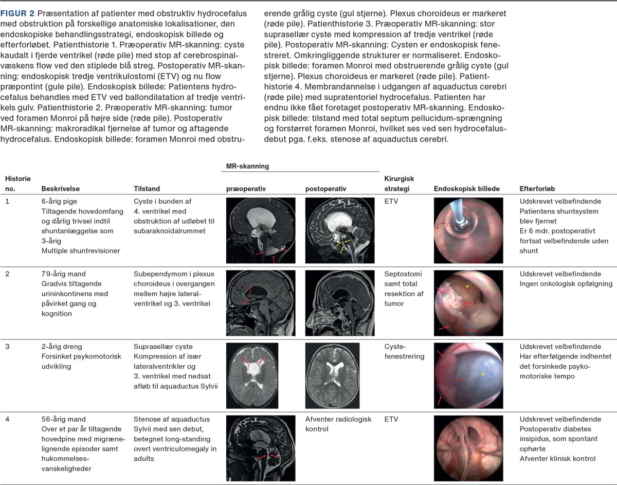Hydrocefalus, som skyldes en obstruerende rumopfyldende proces (kolloid cyste eller intraventrikulær tumor), kan behandles ved endoskopisk fjernelse af processen. I Figur 2 vises eksempler, hvor obstruktioner i ventrikelsystemet er behandlet endoskopisk.