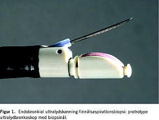 Med hensyn til den prætrakeale del af mediastinum synes endoskopisk ultralydundersøgelse via trachea og hovedbronkier at være en mulig løsning. Gennem nogle år har radialt skannende ultralydminiprober været tilgængelige. Disse kan nedføres via biopsikanalen i et fleksibelt bronkoskop, og i trænede hænder kan nærliggende strukturer erkendes visuelt, således at efterfølgende TBNA kan målrettes. Proceduren kaldes endobronkial ultralydskanning (EBUS). I et studie medførte denne teknisk krævende procedure en reduktion i det nødvendige antal biopsier i forhold til blind TBNA, men ikke til signifikant forbedring af sensitiviteteten. Indtil for nylig var det ikke muligt at producere et ultralydbronkoskop med en biopsikanal, som muliggjorde ultralydvejledt transbronkial biopsi. I dag foreligger der en prototype af et sådant ultralydbronkoskop, som for tiden testes på Amtssygehuset i Gentofte (Figur 1 ). Dette ultralydbronkoskop har en distal diameter på 6,9 mm, en biopsikanal på 2 mm og en 7,5 Mhz ultralydtranducer med en penetrationsdybde på 5 cm og en skanningsvinkel på 50°.