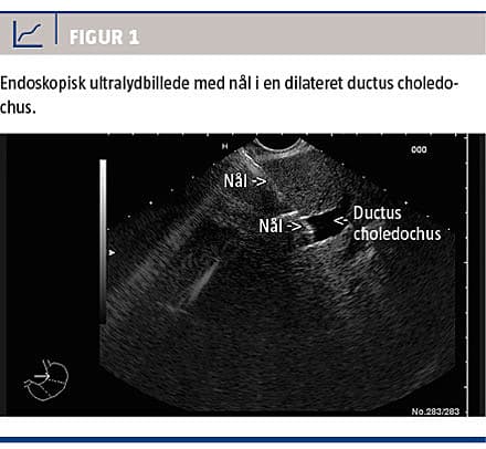 EUS-RV blev første gang beskrevet for over 20 år siden [5] og er en procedure med høj succesrate og få komplikationer. Den udføres i dag rutinemæssigt på flere endoskopiske afsnit, når kanylering af papilla Vateri mislykkes [1, 2, 6]. Oftest udføres EUS-RV umiddelbart efter det mislykkede ERCP-forsøg i samme sedation. Et terapeutisk ultralydendoskop med en lineær transducer benyttes til at identificere galdegangen fra enten ventriklen eller duodenum [7]. Når ultralydendoskopet er i position, og galdegangen visualiseret, punkteres denne endoskopisk ultralydvejledt oftest med en 19-Gauge nål (Figur 1) [2].