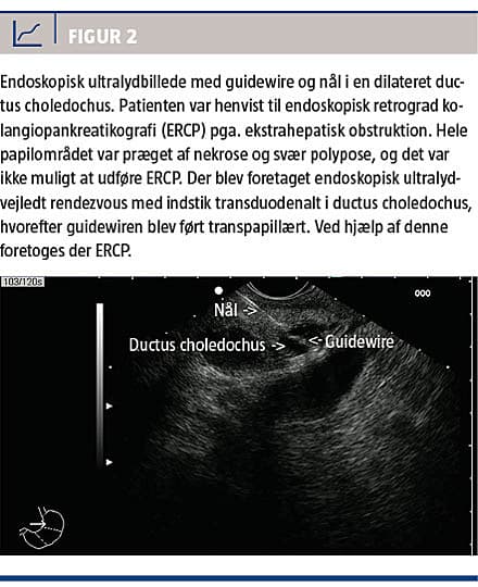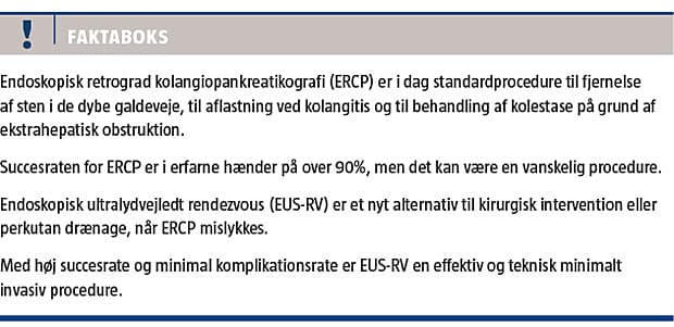 Succesraten for ERCP er i erfarne hænder på over 90% [1, 2], men det kan være en vanskelig procedure, når patienterne har ændret anatomi efter en operation, har periampullære divertikler, tumorinvasion eller andre forhold, som vanskeliggør transpapillær adgang til galdegangene [3]. Når ERCP mislykkes, er kirurgisk intervention eller perkutan drænage oftest næste mulighed, men disse procedurer kan medføre komplikationer og yderligere ventetid [4]. Formålet med denne artikel er at gøre opmærksom på en ny metode, endoskopisk ultralydvejledt rendezvous (EUS-RV), der kan udføres i samme seance som den mislykkede ERCP.