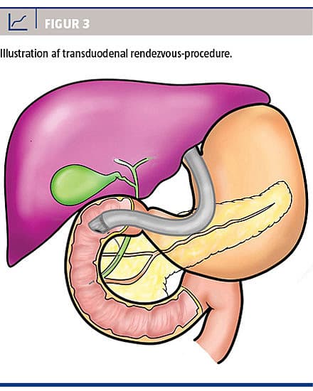 For at sikre, at ductus choledochus er korrekt kanyleret, aspireres der galde gennem nålen, og der fremstilles derefter et kolangiogram ved kontrastinjektion og røntgengennemlysning. Når man har sikret korrekt placering af EUS-nålen, introduceres en 0,889 mm-guidewire via nålen (Figur 2). Guidewiren manipuleres derefter igennem papillen og/eller strikturen og ud i duodenum, hvorefter nålen og derefter EUS-endoskopet trækkes tilbage under flouroskopisk visualisering, for at sikre at guidewiren forbliver på plads. Duodenoskopet nedføres til standard ERCP-position foran papillen, og guidewiren trækkes derefter op gennem duodenoskopet, hvorefter kanylering af papilla Vateri kan udføres som sædvanligt (Figur 3). Det er ved rendezvousproceduren en forudsætning, at man kan få et duodenoskop placeret i duodenums andet stykke ud for papillen.