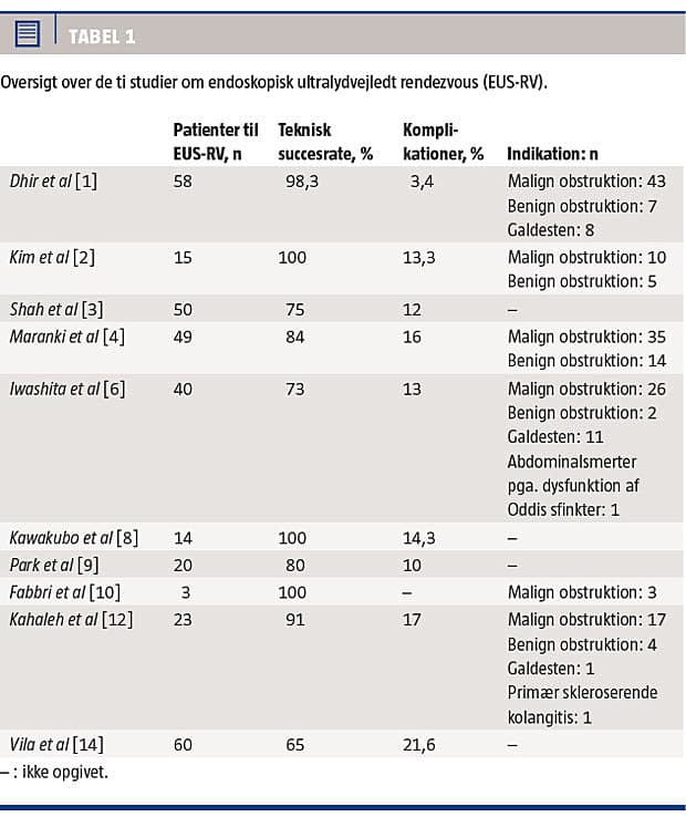 Der foreligger ti EUS-RV-studier, som varierer i størrelse fra tre til 60 patienter. I studierne beskrives en succesrate på 65-100% (Tabel 1). Den største patientgruppe er beskrevet af Vila et al, som også har den laveste succesrate på 65% [14]. Fabbri et al og Kawakubo et al beskriver begge succesrater på 100% i to af de mindre studier på henholdsvis tre og 14 patienter [8, 10]. Dhir et al præsenterer en større caseserie med 58 patienter, hvor succesraten var 98,3%. De sammenligner deres caseserie med en kontrolgruppe, der havde fået foretaget præ-cut-papillotomi, med en succesrate på 95,8% [1].