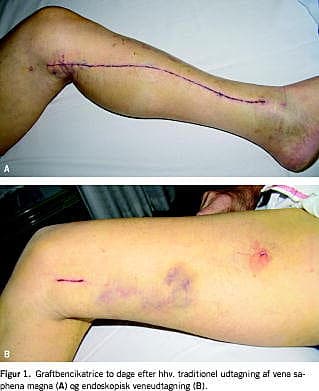 Trods en stigning i brugen af arterier ved bypasskirurgi er vena saphena magna fortsat den hyppigst anvendte conduit ved koronar bypasskirurgi. Den traditionelle måde at udtage venen på er gennem en lang incision fra lige over mediale malleol op til knæniveau eller helt op til femur, afhængig af behovet for materiale (Figur 1A ). Disse lange incisioner er forbundet med en vis postoperativ morbiditet, især hos patienter med diabetes, dårlig perfusion i underekstremiterne og efter langvarig steroidbehandling. I en dansk spørgeskemaundersøgelse med 527 koronar bypassopererede patienter fandt man således betydende gener fra benet hos 13% af patienterne [1]. I større udenlandske studier har man påvist problemer med sårhelingen i benet hos op til 26% af patienterne [2, 3]. Ved hjælp af endoskopisk udstyr kan vena saphena magna udtages gennem en lille incision (Figur 1B ), hvilket har vist sig at reducere antallet af sårkomplikationer betydeligt [4, 5]. På Thoraxkirurgisk Afdeling, Rigshospitalet, har vi anvendt endoskopisk veneudtagning siden januar 2004, og i denne artikel beskrives metoden og vore præliminære resultater.