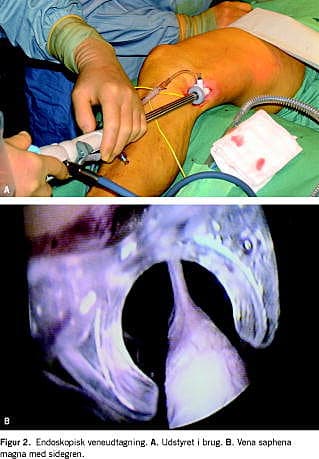 I perioden fra januar til oktober 2004 fik 38 patienter udtaget vena saphena magna endoskopisk. Patienterne var ikke selekterede og udgjorde kun en mindre del af den samlede patientpopulation, da endoskopisk veneudtagning afhang af tilgængeligt udstyr (endoskopisøjle) og operatør. Venen blev udtaget fra femur og ikke fra crus, som ellers er sædvane, da knæet og mediale malleol vanskeliggør anvendelse af stift skop på crus. Udstyret var fra Guidant (VasoView 5 EVH System - pris ca. 3.000 kr.) og benyttes således: Først identificeres vena saphena magna gennem en 2 cm længdegående incision medialt på benet lige over knæet. Derefter isættes en port med en ballon, der sidder tætsluttende i incisionen, så der kan insuffleres CO2 under veneudtagningen for at eksponere venen (Figur 2 ). Ved hjælp af en kegleformet, gennemsigtig spids for enden af endoskopet dissekeres venens anteriore og posteriore sider fri i den ønskede længde (som regel til lysken). Herefter løsnes venen circumferentielt, og sidegrene deles med en kombineret endoskopisk elkoagulator og saks. Det er vigtigt at overbrænde sidegrenene mindst 2 mm fra venen for at undgå skader på denne. Når alle sidegrenene er fundet og delt laves et lille snit i lysken, hvor venens proksimale ende ligeres og klippes. Endoskopet fjernes, og venen kan trækkes ud. Sidegrenene sikres med hæmoclips eller oversys med 7-0 Prolene. De to små incisioner lukkes med vicryl i lag, og en let komprimerende forbinding lægges om benet. Veneudtagningstiden er tiden fra første incision til huden er lukket. Venekvaliteten vurderes ud fra diameter og evt. varicer (en vene af god kvalitet har en diameter på 3-4 mm og ingen varicer).