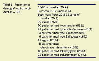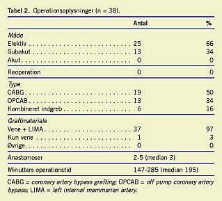 I perioden fra januar til oktober 2004 fik 38 patienter udtaget vena saphena magna endoskopisk (29 mænd og ni kvinder, medianalder 75 år). Alle operationerne blev foretaget af en af to erfarne hjertekirurger, og patienternes køn, alder, Euroscore, body mass index (BMI) og konkurrerende lidelser fremgår af Tabel 1 . Der var ikke tale om egentlig selektion med henblik på endoskopisk veneudtagning, men da de fleste af de 38 patienter blev opereret af en kirurg, der vanligvis ope-rerer mange ældre og vanskelige patienter, kan dette genfindes i materialet. Tretten operationer blev foretaget uden brug af hjertelungemaskine (OPCAB). Af de resterende 25 var 19 isolerede koronare bypassoperationer, mens seks var kombinerede indgreb (koronar bypass + klapoperation eller operation for atrieflimmer). Der var ingen akutte operationer eller reoperationer, men i øvrigt var det typiske koronare bypass-operationer, hvad angår type og sværhedsgrad (Tabel 2 ).