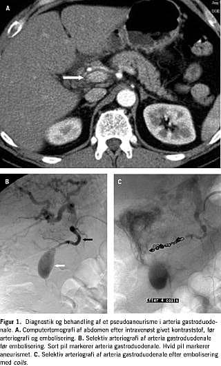 Patienten var en mand født i 1950 og siden april 2001 kendt med alkoholinduceret kronisk pankreatitis. Patientens pan-kreatitis blev kompliceret af dannelse af en pseudocyste ved pancreas, som blev tømt ultralydvejledt tre gange i 2001. Primo januar 2002 havde patienten en et døgn varende episode med melæna og blodtransfusionsbehov. En gastroduodenoskopi viste gastritis og duodenitis, og patienten blev sat i behandling med en protonpumpehæmmer. To uger senere fik han pludselig stærke smerter i den øvre del af abdomen med udstråling til ryggen og op i brystet. Smerterne var væsentligt værre end hans sædvanlige smerter. Ved en objektiv undersøgelse var patienten udtalt øm i epigastriet. Biokemiske undersøgelser viste normale forhold, bortset fra en marginal forhøjet S-amylase og c-reaktiv protein. En computertomografi (CT) viste et pseudoaneurisme i arteria gastroduodenale. Pseudoaneurismet var beliggende i en pancreaspseudocyste (Figur 1A ). Der blev foretaget arteriografi, som viste et 2×3 cm stort pseudoaneurisme i arteria gastroduodenale (Figur 1B). Herefter blev der foretaget superselektiv arteriografi af arteria gastroduodenale, og arterien blev endovaskulært emboliseret med coils både proksimalt og distalt for pseudoaneurismet (Figur 1C). Patientens smerter aftog betydeligt efter emboliseringen, og han blev udskrevet tre dage senere. En kontrol-CT efter en måned viste ingen tegn på recidiv af pseudoaneurismet. Patienten var velbefindende 26 måneder efter behandlingen.