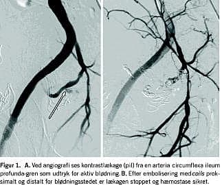 En 50-årig mand blev indlagt til elektiv PAO pga. følger efter Calve-Legg-Perthes sygdom med udvikling af sekundær acetabulær dysplasi. I forbindelse med frilægningen opstod der svær arteriel blødning i det lille bækken. Blødningen blev umiddelbart stoppet ved kompression. Ved efterfølgende karkirurgisk assistance var det ikke muligt at frilægge arteria iliaca interna, hvorfor man ikke opnåede hæmostase. Der blev herefter foretaget bækkenangiografi via a. femoralis, og der blev fundet blødning fra en a. circumflexa ileum profunda-gren (Figur 1A ), som er en sidegren til a. iliaca interna. Hæmostase sikredes ved embolisering med coils distalt og proksimalt for blødningen (Figur 1 B ). Patienten var hæmodynamisk stabil under hele forløbet. Osteotomien blev ikke gennemført, men såret blev efterfølgende lukket. Det postoperative forløb var ukompliceret.