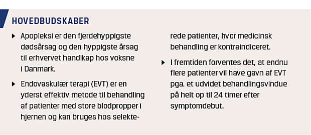 standardbehandling til patienter med akut iskæmisk apopleksi som følge af blodpropper i Danmark. Som supplement hertil har man igennem en årrække forsøgsvis tilbudt selekterede patienter endovaskulær terapi (EVT). Hidtil har EVT forudgået af IVT været standardbehandling ved store blodpropper, hvis behandlingen igangsættes mindre end seks timer efter ictus. EVT op til 24 timer efter ictus har siden februar 2018 været standardbehandling uden forudgående IVT hos nøje udvalgte patienter. I denne artikel præsenteres den videnskabelige baggrund, proceduren samt de danske erfaringer og resultater med EVT.