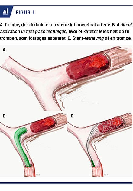EVT er en kateterbaseret behandlingsteknik, som kan benyttes til fjernelse af store blodpropper intrakranialt, hvor IVT har ringe effekt. Der benyttes lange katetre, typisk indført i arteria femoralis, til at skabe adgang til halsens og hjernens blodkar (Figur 1) [3-6].
