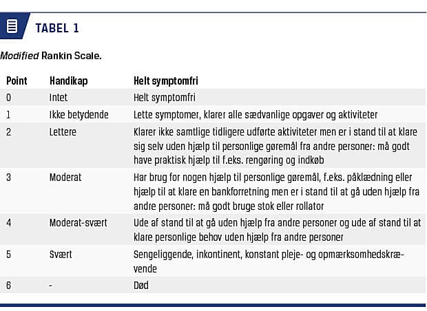 I en metaanalyse baseret på ovenstående studier påviste man, at 46% af de EVT-behandlede patienter opnåede funktionel uafhængighed bedømt ud fra modified Rankin Scale (mRS) (Tabel 1) mod blot 26% af de patienter, som udelukkende blev behandlet med IVT. For at opnå en reduktion på et point på mRS var NNT kun 2,6, og for fuld eller betydende remission var NNT 3-7. Der var ingen forskel på dødelighed eller symptomatisk intrakranial blødning ved de to behandlinger [15].