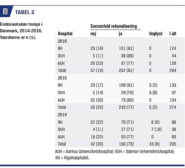 I 2016 fik 294 patienter foretaget EVT i Danmark (Tabel 2). Anbefalinger vedr. udredning, indikation og overflytning af patienter med apopleksi er sammenfattet i Sundhedsstyrelsens retningslinjer for EVT [17].