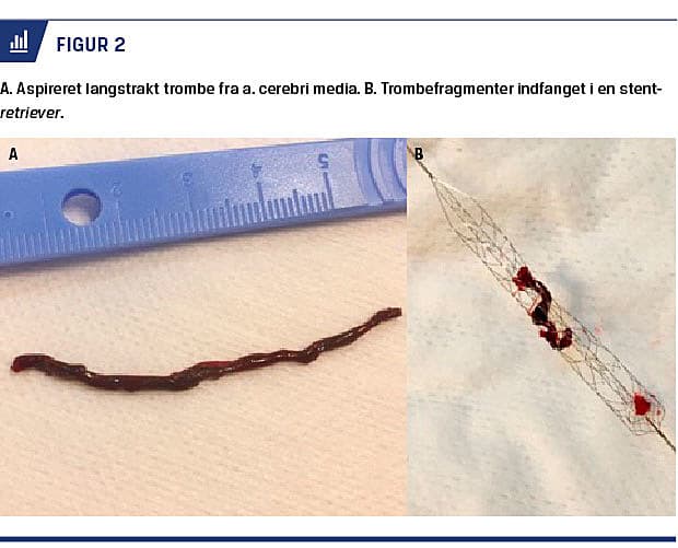 katetret. Dette kan gentages. Ved manglende rekanalisering kan katetret benyttes til at føre en stentriever op igennem tromben. 2) Ved stentrieving føres en mikroguidewire igennem tromben. Over guidewiren føres et mikrokateter op til tromben, og guidewiren fjernes. En sammenklappet selvekspanderende stent (stentriever) føres op igennem mikrokateteret. Når den er beliggende ud for tromben, trækkes mikrokateteret tilbage, hvorved stentriever’en udløses og udfoldes i tromben. Det finmaskede net skærer sig igennem trombematerialet, hvorved de to integreres. Herefter kan stentriever’en med trombe retraheres ud i kateteret og under aspiration med et aspirationskateter tæt på tromben suges tromberester ud (Figur 2). For at undgå distal embolisering af løsrevene fragmenter kan blodgennemstrømningen stoppes midlertidigt ved balloninflation i ipsilaterale a. carotis interna med et ballonkateter. Ved samtidig aspiration ændres flowretningen, og dermed mindskes perifer embolisering af trombedébris under ekstraktion af stenten [23].