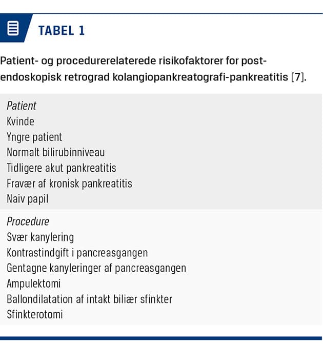 Kendte risikofaktorer for PEP er relateret til både patienten og proceduren (Tabel 1), og effekten af de enkelte risikofaktorer synes at være synergetisk frem for additiv. Således kan en yngre kvinde med normalt bilirubinniveau, hvor man har mistanke om sphincter Oddi-dysfunktion, have en risiko for PEP på over 40% og samtidig en højere risiko for at udvikle svær PEP med dødelig udgang [8].