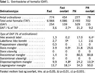 I overførte faste ordinationer var der signifikant færre OAF, 2,7%, end i førstegangsordinationer, 3,6% (p < 0,05) (Tabel 1 ). Bortset fra antallet af ordinationer med manglende lægesignatur var der generelt et fald i de øvrige typer af OAF. Der var ikke signifikant forskel på antallet af OAF mellem førstegangs-p.n.-ordinationer og overførte p.n.-ordinationer.