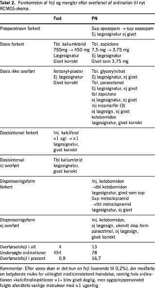Der var 454 overførte faste ordinationer og 78 overførte p.n.-ordinationer. Vi fandt henholdsvis 4 (0,9%) og 13 (16,7%) overførselsfejl (Tabel 2 ). I ingen af tilfældene var der mistanke om, at de medførte UMRH, men en (0,2% af overførte ordinationer) havde potentielt kunnet medføre en alvorlig tilstand. Hyppigste fejl var manglende overførsel af dosis ved p.n.-ordinationerne. I seks ud af de i alt 17 overførselsfejl (35%) var den overførte ordination lægesigneret. Dette gjaldt også for den fejlagtige ordination, der kunne have medført en UMRH.