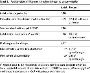 Der indgik 123 medicinske og 70 kirurgiske patienter med henholdsvis 1.036 og 547 ordinationer. I alt 92,8% af formalia var overholdt, men fordelingen på ordinationerne betød, at kun 63% af ordinationerne var helt korrekte. Hyppigste OAF var fravær af lægesignatur i 20,3% af tilfældene, herefter kom manglende dosisinterval i 18,8%, manglende angivelse af dispenseringsform i 11%, manglende dosisangivelse i 9%, manglende labelanvendelse i 4% og ukorrekt labelfarve i 1,5%.