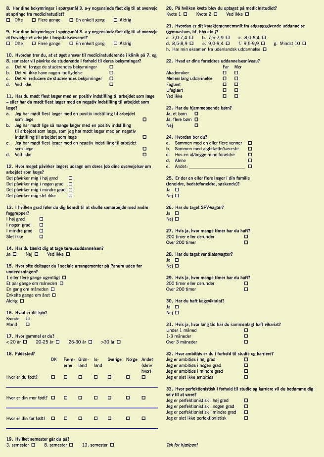 Spørgeskemaet blev udviklet på baggrund af tre fokusgruppeinterview med i alt 11 medicinstuderende på tre forskellige semestre. Spørgeskemaet blev pilottestet og modificeret to gange, efter at testpersoner (medicinstuderende) enkeltvis besvarede og kommenterede forståelighed, formulering og relevans af alle spørgsmål. I alt indgik der 33 spørgsmål opdelt i sektioner, der vedrørte motivation for at søge medicinstudiet, forventninger og bekymringer i relation til fremtiden og demografiske data. Denne artikel omhandler kun en begrænset del af spørgeskemaet, nemlig de studerendes bekymringer og enkelte demografiske data. Svarkategorierne vekslede mellem ordinalskalaer med fire svaralternativer og dikotome svarskalaer (ja/nej). Spørgeskemaet kan ses på www.herlevsimulator.dk og på www.ugeskriftet.dk