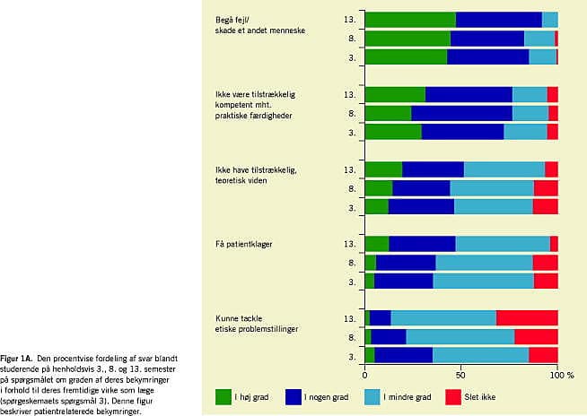 Summary Are Danish medical students concerned about their future job? A questionnaire study. Ugeskr Læger 2007;169(1):45-50 Introduction: Knowledge about the thoughts of Danish medical students regarding their job future is limited. The aim of this study was to investigate whether medical students are concerned about their future work, and if so, to describe the types of concerns they have, to what degree they are concerned, possible reasons for and consequences of their concerns; furthermore, to evaluate if gender and semester influate on the concerns. Method: A questionnaire was developed based on focus group interviews with medical students. The questionnaire was sent to 596 medical students from 3rd, 8th, and 13th semester at Copenhagen University. Results: The response rate was 69.9%. A substantial number of students (47-90%) were very concerned or concerned to a certain degree with regard to aspects of working life that related to the patient and working conditions. A positive relation was seen between being highly concerned or concerned to a certain degree and daily or often worrying. Possible causes of the concerns were related to their experience through their clinical stays, the curriculum, comments about the job made by medical doctors and others and their own personality. Every sixth student had considered leaving university or refraining from entering clinical training due to these concerns. Conclusion: Medical students from 3rd , 8th , and 13th semester are concerned about their future work, especially in relation to the patient, regarding, for example, the risk of committing an error or being incompetent in relation to practical skills, but also work-related concerns are mentioned.