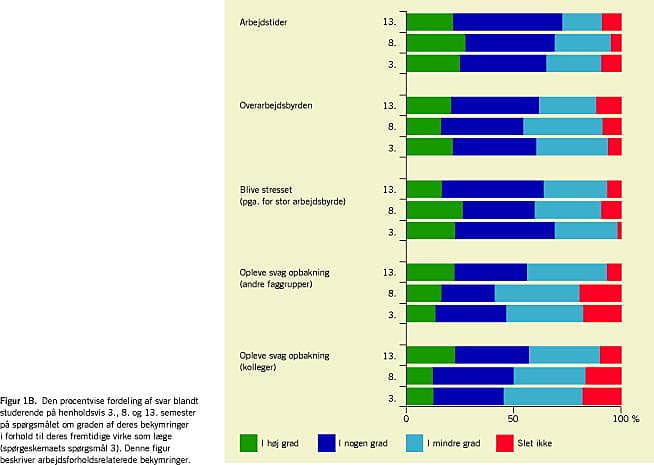 I Figur 1A og Figur 1B ses den procentvise fordeling af svar blandt studerende på henholdsvis 3., 8. og 13. semester på spørgsmålet om graden af deres bekymringer i forhold til deres fremtidige virke som læge (spørgeskemaets spørgsmål 3). Bekymringerne kan deles op i en patientorienteret kategori (Figur 1A) og en kategori, der vedrører arbejdsforhold (Figur 1B).