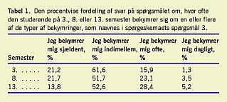 I Tabel 1 ses den procentvise fordeling af svar på spørgsmålet om, hvor ofte den studerende på 3., 8. eller 13. semester bekymrer sig om en eller flere af de typer af bekymringer, som nævnes i spørgeskemaets spørgsmål 3.