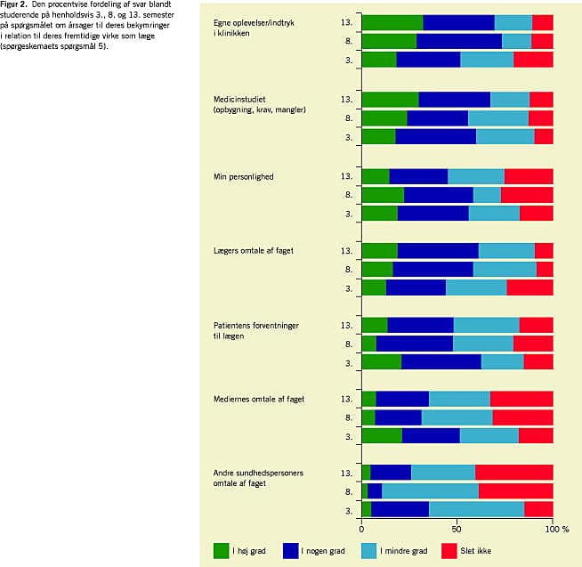 I Figur 2 ses den procentvise fordeling af svar blandt studerende på henholdsvis 3., 8. og 13. semester på spørgsmålet om årsager til deres bekymringer i relation til deres fremtidige virke som læge (spørgeskemaets spørgsmål 5). De studerende på alle semestre mente, at væsentlige årsager var baseret på egne oplevelser/indtryk i klinikken og medicinstudiets opbygning, krav og mangler. De studerendes personlighed og lægers omtale af faget havde også betydning. Signifikant flere fra 8. og 13. semester end fra 3. semester mente, at egne oplevelser/indtryk i klinikken og lægers omtale af faget i høj grad eller i nogen grad var årsager til deres bekymringer (p = 0,004, p = 0,006). En signifikant større andel af de studerende på 3. semester end studerende på 8. og 13. semester angav, at mediernes omtale af faget (p = 0,001, p = 0,009) og patienternes forventninger til lægen (p = 0,013, p = 0,021) i høj grad eller i nogen grad var årsag til bekymringerne.