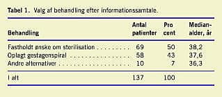 Af de 151 henviste kvinder udeblev 14 fra samtale og udgik derfor af undersøgelsen. Af de resterende 137 kvinder fastholdt 69 i alderen 25-47 år efter informationssamtalen ønsket om sterilisation. Der var 58 kvinder i alderen 26-48 år, som valgte at få oplagt gestagenspiral, og der var ti kvinder i alderen 29-46 år, som valgte andre alternativer såsom sterilisation af manden, gestagenimplantat, p-piller eller kobberspiral. Resultatet fremgår af Tabel 1 .
