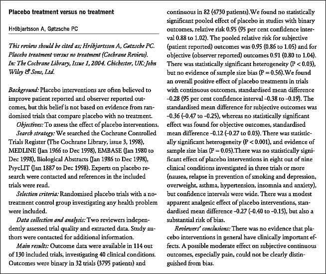 Conchrane-bedømmelsen er baseret på 114 kliniske studier, som alle inkluderer en gruppe patienter i placebobehandling og en gruppe ubehandlede patienter. Undersøgelsen viser, at placebo måske har en moderat effekt på smerte, men effekten kunne ikke klart adskilles fra bias.