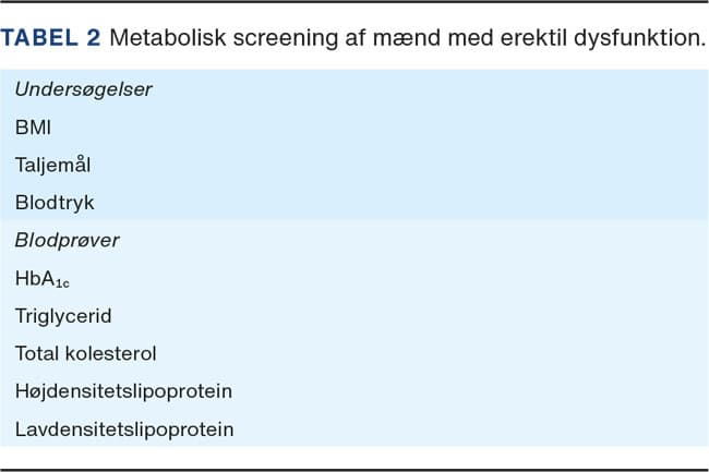 Der kan også være indikation for at supplere blodprøver med en testosteronmåling ved subjektive eller objektive tegn på hypogonadisme, der er særligt hyppig hos diabetikere (Tabel 1). Subjektive symptomer inkluderer nedsat libido, nedsat energi og øget irritabilitet. Man skal være opmærksom på, at selvom MetS og nedsat libido er associeret til hypogonadisme, kræves der meget lave koncentrationer af testosteron, før det i sig selv forårsager ED [7, 8, 23]. Testosteronsubstitution er indiceret ved en kombination af symptomer og biokemisk testosteronmangel. Der findes ikke en universelt accepteret grænseværdi, men i hovedparten af litteraturen betragtes værdier > 12 nmol/l som normale og værdier < 8 nmol/l som nedsatte, mens værdier herimellem repræsenterer et grænseområde. Nogle tilstande, herunder overvægt, kan medføre lave niveauer af seksualhormonbindende globulin og derved andelen af biotilgængeligt testosteron. Det gør, at koncentrationen af total testosteron kan fremstå nedsat, uden der er tale om en egentlig mangeltilstand [22].