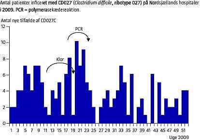 Infektion med Clostridium difficile er den hyppigste årsag til nosokomiel diarre i de industrialiserede lande. Infektionen ses især under indlæggelse, hvor der gives antibiotikabehandling, og den spænder klinisk fra asymptomatisk kolonisation over mild diarre til pseudomembranøs colitis, toksisk megacolon og colonperforation. Flere subtyper, herunder C. difficile , ribotype 027 (CD027), er associeret med et alvorligere forløb end normalt. CD027 har forårsaget udbrud i både Nordamerika og i Europa [1]. Den større virulens har formentlig sammenhæng med en øget toksinproduktion.