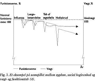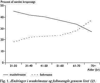 Højde, vægt og dermed body mass index (BMI) ændres med alderen. Longitudinale studier af ældre over 70 år viser, at både højde og vægt reduceres. Ændringen i kropssammensætningen betyder endvidere, at ældre ved et bestemt BMI vil have et højere fedtindhold i kroppen end yngre med et tilsvarende BMI (Fig. 1 ). Den aftagende legemshøjde medfører i sig selv et stigende BMI. Et højt BMI er gunstigt, når det er udtryk for en stor muskelmasse og dermed god funktionsevne, mens et utilsigtet vægttab er relateret til risiko for tidlig død, uanset niveauet af BMI.