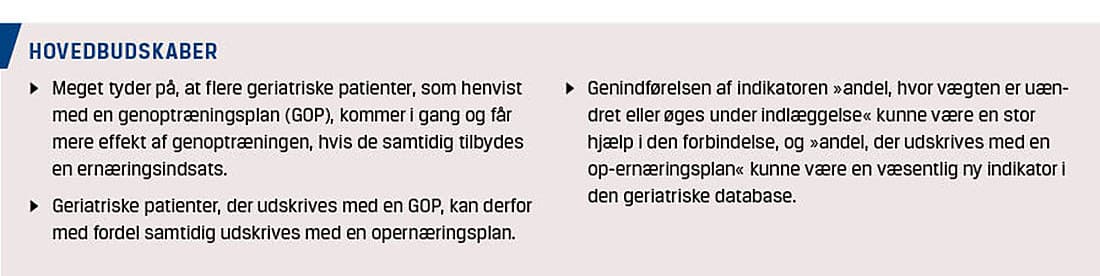 indsats til ældre medicinske patienter, der udskrives med en genoptræningsplan« [24]. En begyndende afdækning i forskningsprojektet viste, at kun 44% af de medicinske/geriatriske patienter, der blev udskrevet med en GOP, påbegyndte genoptræningen, og kun 18% gennemførte genoptræningen som planlagt. Den hyppigste årsag til, at borgerne ikke påbegyndte genoptræningen, var genindlæggelse. Det primære formål var derfor at få flere i gang med genoptræningen. Forløbet tog udgangspunkt i de eksisterende arbejdsgange og den foreliggende evidens. Således har ernæringsindsatser i form af råd fra en klinisk diætist og/eller industrielt fremstillede energi- og proteinrige drikke til geriatriske patienter/borgere vist en evident effekt i forhold til at bevare/øge funktionsevnen og reducere risikoen for (gen)indlæggelser, samtidig med at der har kunnet udløse en samfundsøkonomisk gevinst [4-6, 17].