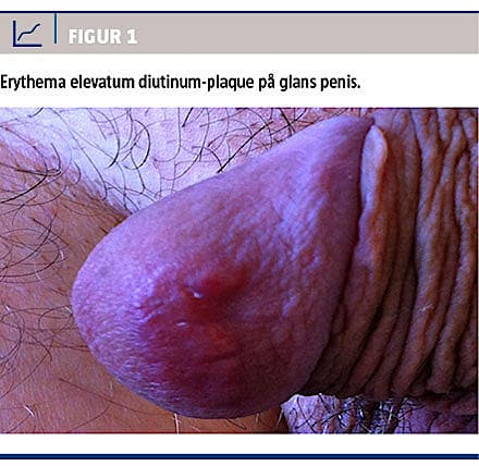 Vi præsenterer et tilfælde, hvor EED-forenelige forandringer blev fundet på glans penis, hvilket kun er beskrevet tre gange tidligere i litteraturen [2-4] og aldrig tidligere i Danmark. EED har vist sig ofte at være associeret med underliggende lidelser som infektioner, autoimmune sygdomme og hæmatologiske lidelser [5], hvorfor det er vigtigt at erkende diagnosen og sikre videre screening for associerede lidelser.