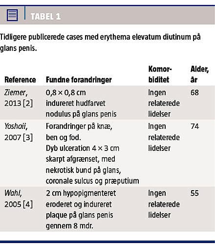 EED på glans penis er en yderst sjælden manifestation, som kun er beskrevet tre gange tidligere i hhv. Tyskland i 2013 [2], Japan 2006 [3] og USA 2005 [4] (Tabel 1). Formålet med denne kasuistik er at rapportere om et ganske sjældent fund og dermed udbrede kendskabet til diagnosen.