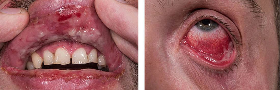 En 34-årig mand blev henvist til dermatologisk vurdering for sår på læberne og i munden samt tiltagende røde, væskende, sammenklistrede øjne. Forudgående havde han haft hoste og halssmerter, som var blevet penicillinbehandlet i fire dage, uden at der var sket nogen bedring. Klinisk blev der fundet udbredte, svære erosioner i mundslimhinden samt på tungen og læberne, og ved inspektion af øjnene blev der observeret svær konjunktivitis og synekkier, mens den øvrige hud var uafficeret. Han blev behandlet med roxithromycin på mistanke om infektionsudløst erythema multiforme (EM) major, hvilket blev bekræftet ved svælgpodning, der var positiv for Mycoplasma pneumoniae. Podning for herpes simplex-virus var negativ. Erosionerne i munden ophelede gradvist over de næste uger, og synekkierne blev løsnet over flere gange på en øjenafdeling.
