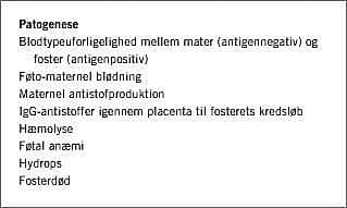 Ved uforligelighed mellem moderens og fosterets blodtype kan der ved føto-maternel blødning opstå erytrocytimmunisering. Moderens immunsystem vil producere antistoffer mod fremmede blodtypeantigener, som fosteret har arvet fra faderen. Antistofferne kan i fosterets kredsløb give anledning til hæmolyse resulterende i anæmi, hydropsudvikling og evt. fosterdød. Immunisering kan principielt ske ved alle typer uforligelighed, men kun få er klinisk relevante, hvoraf rhesusimmunisering er den væsentligste. Trods indførelse af rhesusprofylakse i Danmark i 1969 forekommer der stadig 10-15 tilfælde af rhesusimmunisering årligt her i landet, hvor transfusionsbehandling af fosteret må foretages. Hertil kommer yderligere ca. fem transfusionskrævende tilfælde, der skyldes anden erytrocytimmunisering. I det følgende beskrives patogenese, profylakse, opsporing, kontrol samt behandlingsmuligheder med vægt på den nyeste udvikling.