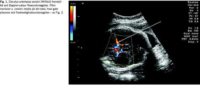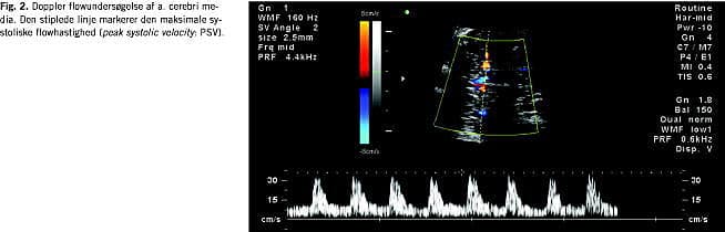 I graviditeter med anæmirisiko for fosteret ønskes viden om fosterets hæmoglobinkoncentration (Hb) som næste trin i udredningen. Niveauet er afgørende for om transfusionsbehandling skal iværksættes eller om igangsættelse af fødslen bør tilrådes, hvis gestationsalderen er fremskreden. Mange metoder har været forsøgt for at opnå denne viden, uden at være nødsaget til at foretage cordocentese med de dertil hørende risici. Antistofniveauet i maters blod giver over en vis cut-off- værdi en dårlig prædiktion af foster-Hb. Hydrops/ascites hos fosteret er meget let at se ved ultralydskanning, men problemet med dette sygdomstegn er, at det forekommer sent i anæmiudviklingen, og at ikke alle fostre udvikler hydrops selv ved meget lav Hb. Endvidere at resultaterne ved behandling af fostre, der allerede er hydrope, når behandling påbegyndes, er klart dårligere end for non-hydrope [3]. Gennem mange år anvendtes monitorering ved at foretage gentagne amniocenteser i løbet af graviditeten med bestemmelse af amnionbilirubin. Værdierne plottedes på et Liley chart, hvor fosterets sandsynlighed/risiko for at blive født med henholdsvis svær anæmi, moderat anæmi eller normal Hb kunne aflæses. Da denne metode er invasiv og ikke så præcis, har mange kliniske forskere forsøgt at finde bedre noninvasive metoder. Bl.a. har følgende været evalueret: miltomkreds, leverlængde, diameter af v. umbilicalis, placentatykkelse og flow indices ved Doppler-undersøgelse af mange forskellige føtale kar [4]. Et gennembrud kom, da man begyndte at måle de maksimale systoliske flowhastigheder (PSV) i a. cerebri media (MCA) (Fig. 1 og Fig. 2 ). Mari et al [5] publicerede i 2000 et multicenterstudie med PSV-MCA og føtal-Hb fra 111 gravide med immunisering og 265 kontroller. Ved retrospektiv analyse fandtes at ved en PSV cut-off -værdi på 1,5 multiplikationer af medianværdien (MOM) og en Hb-cut-off -værdi for transfusionskrævende anæmi på 0,65 MOM fandtes en sensitivitet på 100% og falsk positivrate på 12%. I senere studier med evaluering af MCA-Doppler er der fundet sensitivitet på 88-96% og specificitet på 71-100% [6-8]. Efter 35. uge findes dog en meget høj falsk positivrate [6]. Kontrol med amnionbilirubinbestemmelse er ved mange centre nu erstattet af ultralydkontrol med måling af MCA-PSV.