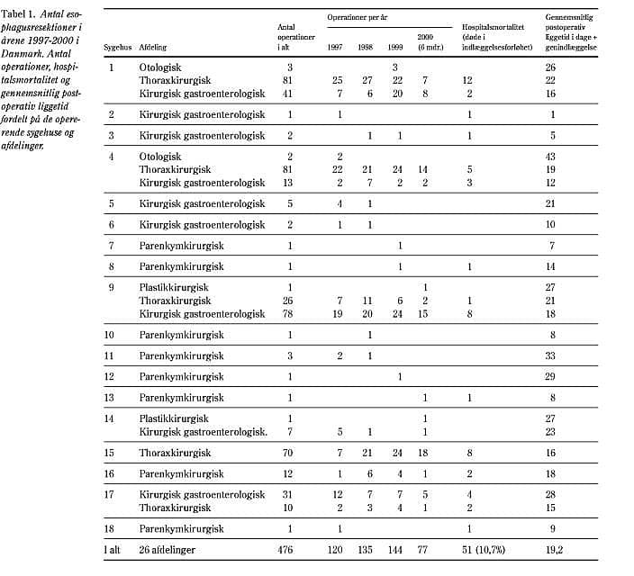 I en landsdækkende opgørelse over resultaterne af den kirurgiske behandling af cancer esophagi og cancer cardiae i Danmark i 1985-1988 (1), hvor hospitalsmortaliteten var 16,6% fandt man, at resultaterne ikke var tilfredsstillende. Operationerne (i alt 464) blev den gang udført på 17 forskellige afdelinger, og man efterlyste en effektivisering mht. både behandling, udvikling og uddannelse. Man foreslog, at dette kunne opnås ved en samling af operationerne på centre, der skulle udføre 20-30 resektioner årligt. Internationalt er der enighed om, at risikoen for livstruende komplikation og høj hospitalsmortalitet er relateret til antallet af operationer, der udføres af den enkelte kirurg, og hospitalets/afdelingens volumen af esophagusresektioner (8-10). Endvidere synes etablering af en multidisciplinær teamfunktion at nedsætte den postoperative mortalitet til 2-5% (3, 10-13).