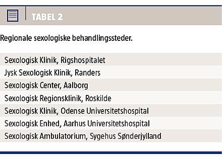 Hos den gruppe patienter, hvor rejsningsfunktionen ikke kan genetableres, kan der være behov for sexologisk rådgivning. Der kan henvises til forskellige klinikker i landet (Tabel 2). Her vil hovedbudskabet være, at der kan findes glæde i meget andet end penetrativt samleje. Dette kan inkludere alt fra simple kærtegn til forskellige former for legetøj, og det er faktisk muligt at opnå orgasme ved stimulation uden rejsning. Også den seksuelle lyst kan igennem rådgivningen øges hos nogle mænd [30].