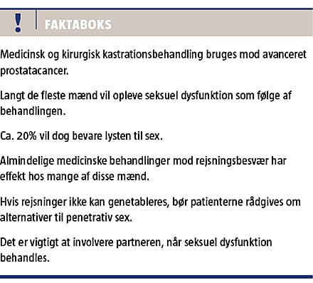 -antagonister eller kirurgisk i form af bilateral orkiektomi. Ved sænket testosteronniveau hæmmes prostatacancercelledelingen, hvilket medfører apoptose. Behandlingen er symptomlindrende og forbedrer overlevelsen [1]. Fordi testosteron har stor betydning for bl.a. seksuel lyst og rejsningsfunktion (Tabel 1), vil behandlingen som oftest påvirke patienternes seksualitet i væsentlig grad. F.eks. vil rejsningsevnen oftest være svært nedsat eller helt manglende, ligesom den seksuelle lyst oftest er svært reduceret eller helt fraværende. I denne artikel vil vi gennemgå, hvordan kastrationsbehandling påvirker seksualfunktionen, og vi vil skitsere, hvordan patienterne bedst kan hjælpes på dette område.