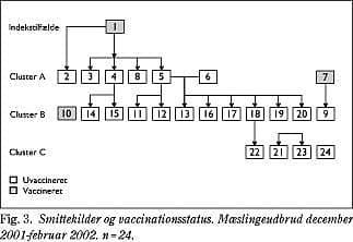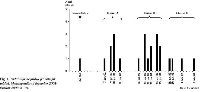 I alt anmeldtes der 24 tilfælde indtil primo februar 2002. Af disse var 20 serologisk verificerede, og fire var søskende til verificerede tilfælde. Fig. 1 viser en epidemikurve for udbruddet, som er karakteristisk for en person til person-smittekilde. De indbyrdes intervaller mellem indekstilfældet og clusters A og B er ca. syv dage, hvilket svarer til den korteste inkubationstid for mæslinger, som er 7-18 dage. Dette kan forklares ved, at mæslinger også smitter, før der kommer udslæt, samt at en kort inkubationstid er hyppigst (8).