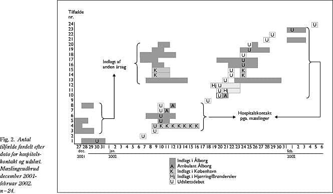 Ultimo december 2001 blev et niårigt dansk barn indlagt på Aalborg Sygehus med høj feber gennem 3-4 dage, under mistanke om malaria. Patienten var kort forinden hjemkommet fra en ferie i Filippinerne. Malaria blev afkræftet, og i øvrigt fandtes normale værdier bortset fra moderat forhøjet laktatdehydrogenase og aspartataminotransferase. Patienten var vaccineret i henhold til det danske vaccinationsprogram. Under indlæggelsen tilkom tør hoste og blegrødt makulopapuløst udslæt mest udtalt på truncus og overekstremiteterne. Ved udskrivelsen efter tre dage fremkom der oplysning om formodet morbillieksposition under udlandsopholdet. Patienten var ikke isoleret, og mæslinger blev først serologisk bekræftet ti dage efter indlæggelse. På dette tidspunkt var en medpatient blevet genindlagt højfebril og nåede at smitte andre indlagte, inden indekspatientens serologisvar medførte isolation og passiv immunisering af indlagte spædbørn op til 15-måneders-alderen.